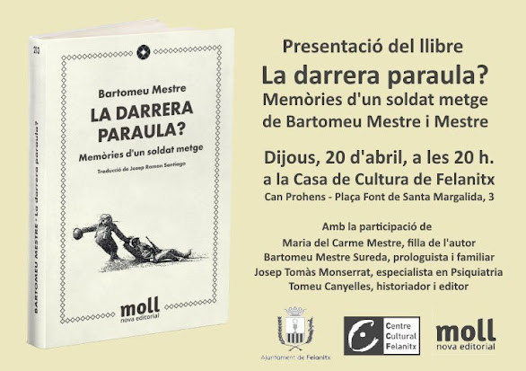 Avui, 20 d’abril, a les 20:00h, a la Casa de Cultura de Felanitx es presentarà el llibre “La darrera paraula? Memòries d’un soldat metge” de Bartomeu Mestre i Mestre.